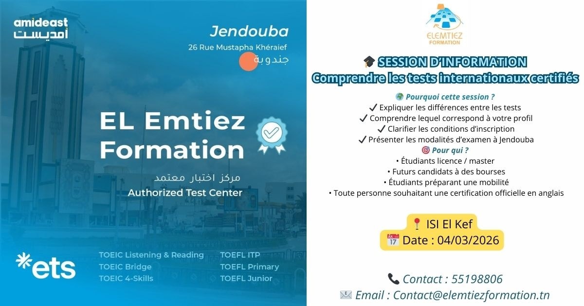 | Description | Boostez votre profil international à l’ISI Kef ! Le mercredi 4 mars 2026 à 10h00, l’Institut Supérieur d’Informatique du Kef (ISI Kef) accueille une session d'information stratégique en partenariat avec EL Emtiez Formation, centre d'examen agréé par AMIDEAST à Jendouba. Vous visez une bourse d’excellence, un Master à l'étranger ou un poste dans une multinationale ? La maîtrise de l’anglais certifiée est votre meilleur atout. Cette rencontre est conçue pour répondre à toutes vos questions :